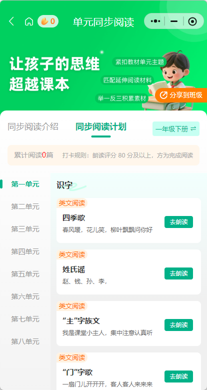 这时候可以借助学习工具。比如语文朗读宝,里面有同步课文点读和朗读,孩子跟着标准发音练;还有生字学习、字词听写、背诵辅助模块。把重复性练习交给工具,家长腾出手来做真正不可替代的事——陪孩子聊读书心得、引导深度思考。