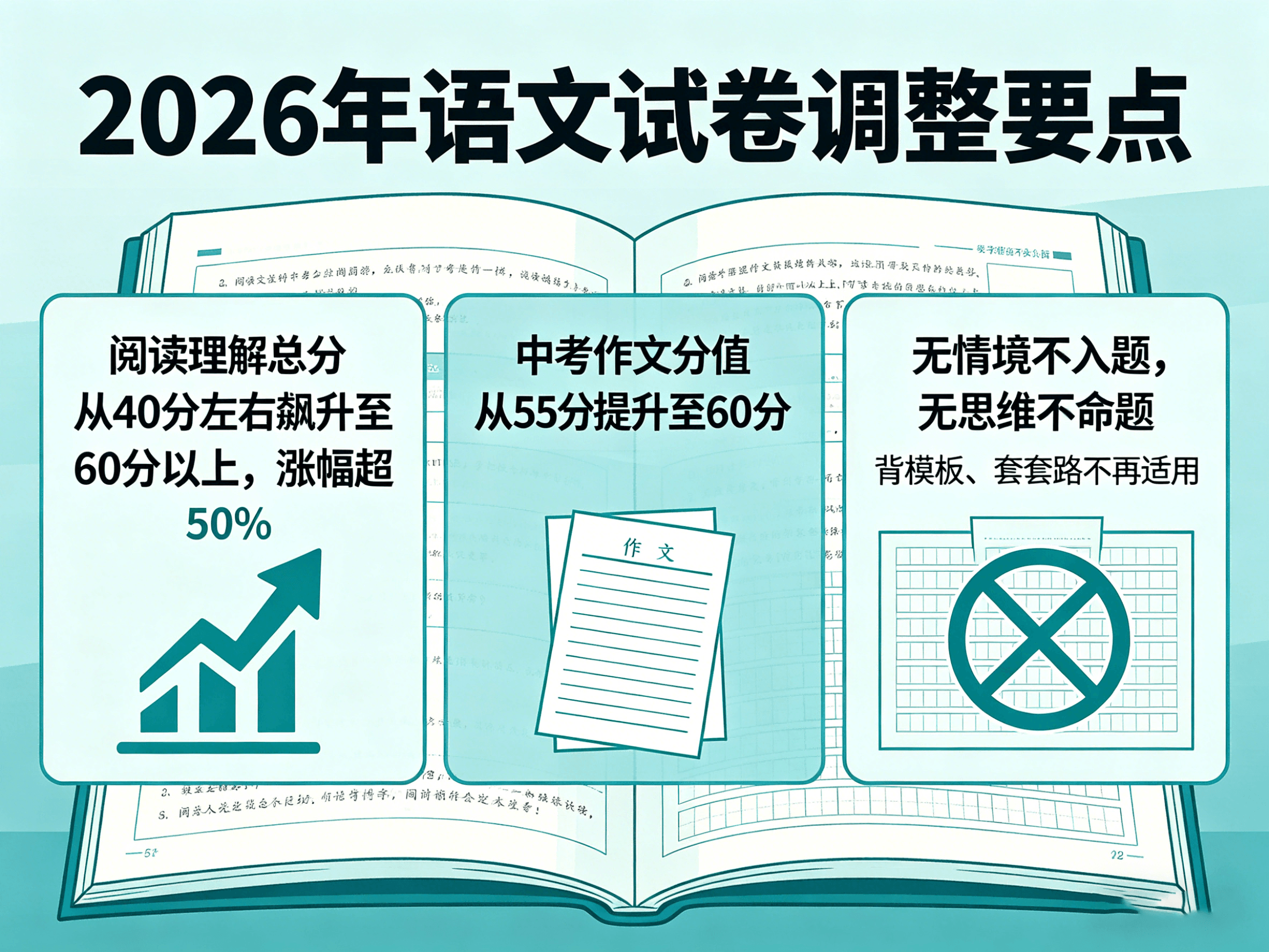 多地教育部门明确2026年语文试卷调整:阅读理解总分从40分左右飙升至60分以上,涨幅超过50%。写作分值也在提升,中考作文从55分涨到60分。最关键的一句话,让很多家长心里咯噔一下——